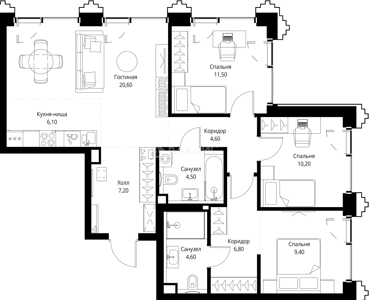 3-комн. квартира, 94,9 м², 21/22 эт.